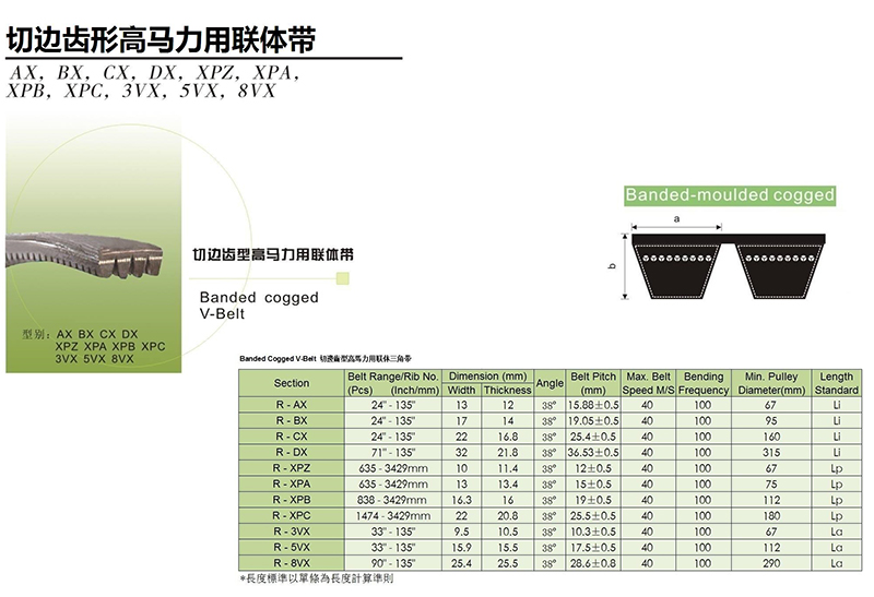切邊齒型高馬力用聯(lián)體帶,由數(shù)條單一齒型膠帶連結(jié)組成,其設(shè)計(jì)可吸收膠帶在正常傳動(dòng)所產(chǎn)生的震動(dòng)。兼具良好的抗油性、抗靜電性及數(shù)條帶的公差一致穩(wěn)定。成型齒的高彎曲性及對(duì)帶輪槽的優(yōu)良密合度,使膠帶不產(chǎn)生高熱,可以增加其使用壽命。其廣泛應(yīng)用在高馬力、高轉(zhuǎn)速的工業(yè)傳動(dòng)裝置和轉(zhuǎn)小直徑帶輪的工業(yè)機(jī)械上。